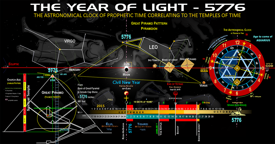 The solar eclipse is in conjunction with the planetary alignments on either side of the Ecliptic that will be illustrated to be occurring in phi ratio to this astronomical delineation of time and space. The planetary alignments also configure a celestial pyramid when the solar eclipse is superimposed with the phi ratio and the planet alignment in Virgo and Leo; the very ‘capstone’ is seen in Leo’s tail section. The Giza pyramid complex of the 3 ‘Time Markers’ could correlate to the 3 prophetic temples of time. They are in the same arrangement in Leo centered on the star Regulus. How this year of 5776 is ‘clocked’ by the Great Pyramid is based on the theory of David Flynn where inches equal years. What Flynn did was to highlight the Great Pyramid’s height from feet to inches, 5776 and deduce that it was a year correspondence.