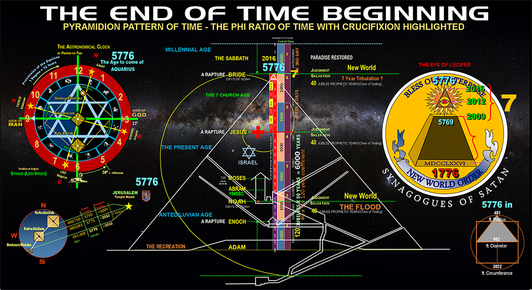 Will the year 5776 see this completion of the metaphorical pyramidion which could correlate to the end of the Church Age as the 7 year countdown to the 3rd Temple is to occur based on the pyramidion pattern of the Great Pyramid or Temple? Will the year 5776 see the initiation of the New World Order as a major global event forces nations to forcefully capitulate their sovereignty as a world leader approaches the stage in an attempt to deliver not only world peace but peace between the Muslims and the Jews? The Illustrations associated with this study have attempted to only approximate the timeline since Adam using the Great Pyramid of Giza blueprint. The supposition is that the pyramidion ending in 5776 inches equals a prophetic correlation the year 5776, thus an end of ‘time’ is possibly wherein the 7 remaining years of Daniel’s prophetic week is to be completed.