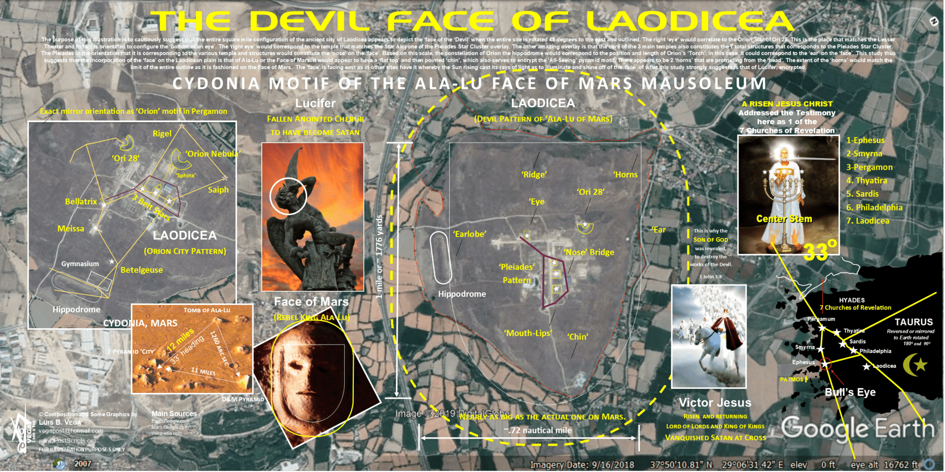 One can Reasonably Conclude that the Designers of the Environ of Laodicea had its LAYOUT match such a Multifaceted Array, Astronomically to the Constellation of Orion and more. There was an Overlay of Correspondences with the Star Cluster of the Pleiades that constituted the ‘Nose’ in the Face of Mars. One is saying that all this was Cryptically Encoded in the Heart of the city with its Temples and Measurements. It also amazingly suggests the Cross-Section of the Great Pyramid with its Chambers and thus the All-Seeing Eye of Lucifer. This Site alone would then dispel any doubt that the Face of Face, that of Ala-Lu is that of Lucifer, the Devil as he is described in Revelation12.