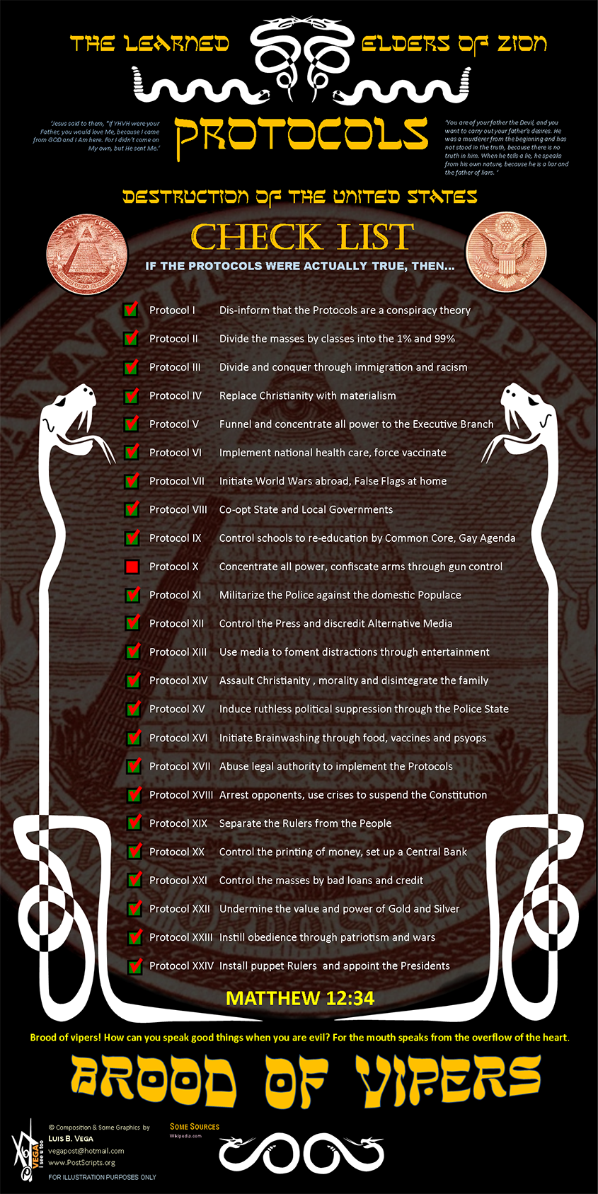 The aim of this study has been to compare the Check List of the Protocols to that which the USA has become. The Protocols have arguably come to pass. It is said to be a fabrication but if one is a careful student of history one can discern that all the objectives from the Check List have been met, just about now for America. Even if it is a forgery, the Protocols are a conspiracy, Jesus Himself stated that there is a conspiracy of having certain Jews usurp the Seat of Moses and call themselves Jews but are not. While on Earth, Jesus confronted these so called Elders with their Protocols that made their way up to the highest positions of power in Israel as they do now and in every nation and have in America. Currently it is no different now in how the Luciferian Religious-Political Elders of Israel treat the masses during the days of Jesus on Earth for which Jesus harshly rebuked them. Such is the case now and will be the case again in the days of Jesus’ return.