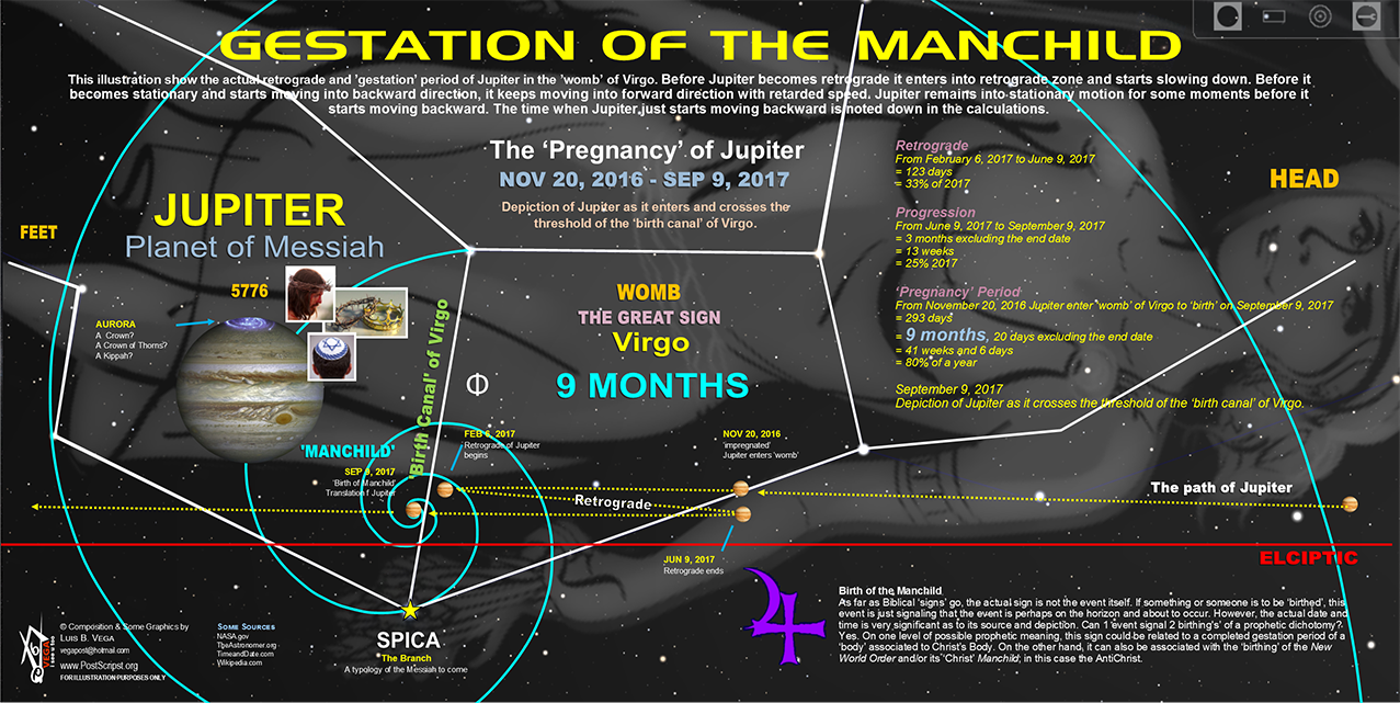 The illustrations accompanying this study attempts to show that the actual ‘birthing’ of Jupiter, concerning the Great Virgo Sign in Heaven from the book of Revelation chapter 12 is prophetic. What makes this Virgo motif unique is that Jupiter has never had its 9-month retrograde occur when the Sun is ‘clothing’ Virgo and the Moon is at her ‘feet’. According to other researchers that have studies this celestial motif, this depiction with Jupiter is a once in a creation event, meaning it has never happened nor will in human history.