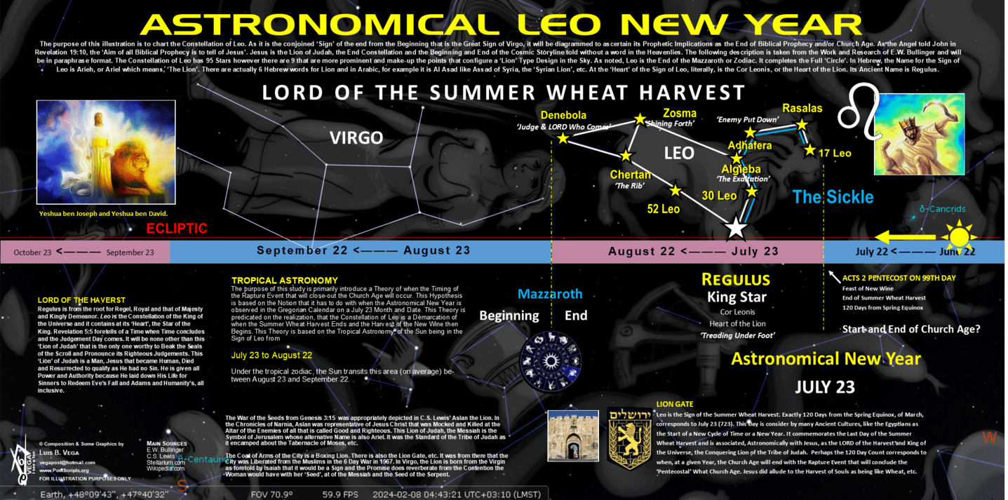 Thus, the Key Theme of this Leo New Year Theory is the ‘Lion King’, and ‘When’. It is well established and accepted that the Constellation of Leo is attributed to the Messiah, the King. Of all the Signs in the Universe, Leo has the King Star and its Head region is even constructed in the shape of a Sickle, etc. It is thus, for these Reasons and Correlations that one presents the Evidence to strengthen this Theory of an Astronomical Leo New Year Rapture Anniversary. Possibly.