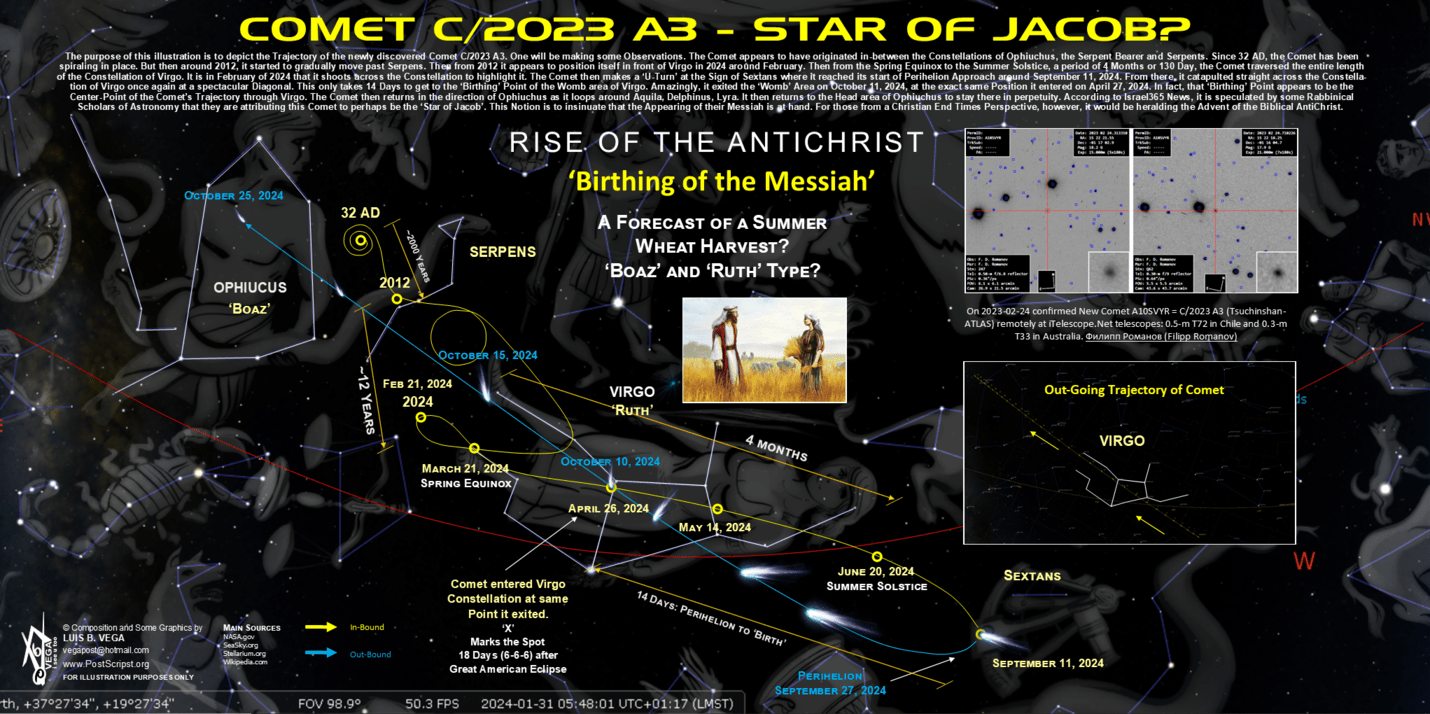 The Religious Jews considered the ‘Star of Jacob’ to be the Comet C/2023 A3, in this case, that was newly discovered in January of 2024. One is not so sure that the Herald of their Messiah, who is not Jesus to them, was signaled by a Comet. What one will argue, is that the Comet C/2023 A3 was heralding the ‘Birth’ of something or someone. And that it was tied to the Constellation of Virgo, which is the Celestial Motif for Israel, etc. Or rather, was it the Herald of the ‘Birth’ or Debut of the AntiChrist instead?