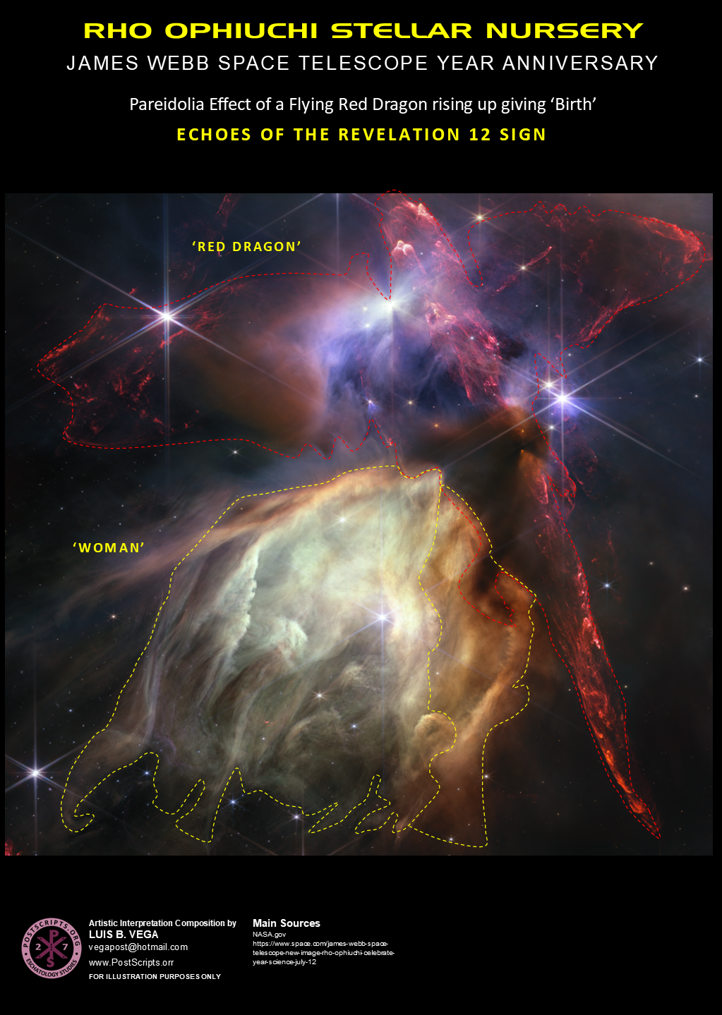 If it were not for Jesus’ Disposition and Willingness to make that happen, all of Humanity would have been doomed to Eternal Damnation. Thus, this Amazing Image of the Ophiuchi Nursery that ‘Births’ Stars is a clear Sign of this Contention still, in one’s Biblical Opinion. YHVH is Signaling a coming ‘Birth’. And that this Depiction, of an apparent Red Dragon and Woman Motif, echoes back to the Revelation 12 Sign. Granted, through the Lens of a Pareidolia Effect.