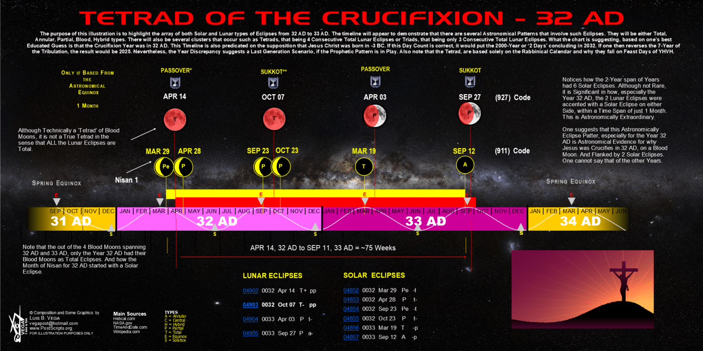 The purpose of this illustration is to highlight the array of both Solar and Lunar types of Eclipses from 32 AD to 33 AD. The timeline will appear to demonstrate that there are several Astronomical Patterns that involve such Eclipses. They will be either Total, Annular, Partial, Blood, Hybrid types. There will also be several clusters that occur such as Tetrads, that being 4 Consecutive Total Lunar Eclipses or Triads, that being only 3 Consecutive Total Lunar Eclipses.