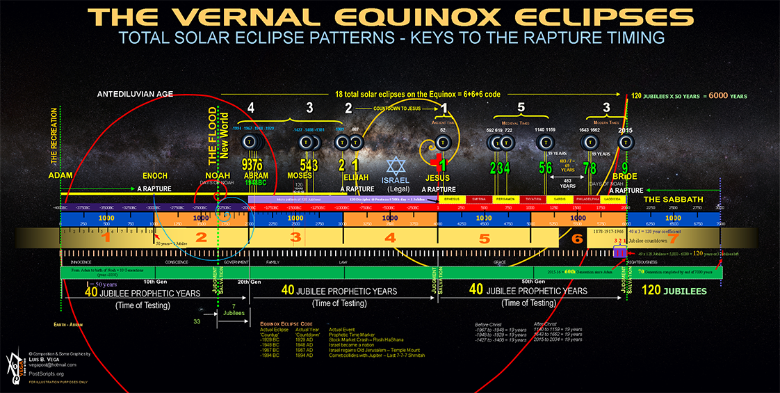 Moreover this code, both with the actual Equinox eclipse sequence and the prophetic dates related to Israel are subject and conform to the laws of the phi ratio proportions. The pattern of the Equinox total solar eclipses will show that the first 4 after the Flood of Noah occur on the Equinox centered on Abram. It appears that it is sort of a verse ‘countdown’ or ‘countup’. This sequence of the particular cluster of Equinox eclipses starts to occur approximately 300 years after the Flood of Noah. The sequence is as follows: -1929 BC, -1948 BC, -1967 BC, and -1994 BC. This sequence in years and eclipses exactly mirror the end in this last generation of 1929, 1948, 1967, and 1994. This specific Equinox eclipse pattern is as though it is a  code and/or a ‘countdown’ since Christ. The Equinox Eclipse Code is as follows.