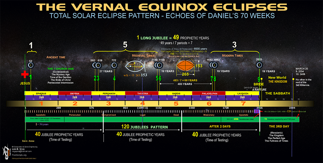 How all this counting, Equinox and prophetic events tie in to 2015 is that the 21 year literal countdown of the last 3 Shmitah sequence since 1994 converge on Rosh HaShana 2015. is based on using as the template the 6000 year timeline dispensation in which the last 70th Week of Years is to be completed at the end of the 7-7-7 countdown. This would mean that the time after 2022 would be within the subsequent prophetic Millennial Kingdom in which the Equinox pair of the 2015 eclipse occurs 19 years later in 2034. The Equinox eclipses occur only in the constellation of Pisces since Christ. The other ‘code’ in this Equinox timeline suggests the 9 eclipses since Jesus are clustered in a 1-5-3 sequence. This is another ‘code’ inference of the amount of fish caught in the net of the Disciples and the Vesica Pisces of the whole Church Age.