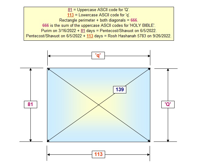 The first letter on the ‘QWERTY’ keyboard is the ‘Q’ and its uppercase ASCII code is 81. The ASCII code for the lowercase ‘q’ is 113. >From Purim on 3/16/2022 to Pentecost, Shavuot and the 55th anniversary of the Six Day War on 6/5/2022 will be 81 days. >From 6/5/2022 to Rosh Hashanah 5783 on 9/26/2022 will be 113 days. How can it be a coincidence that these two precise time periods between these three significant Jewish/Christian holidays be hidden in the first letter of the 'QWERTY' keyboard used around the world?