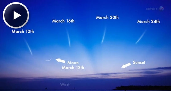 The best dates to look may be March 12th and 13th when Pan-STARRS emerges in the western sunset sky not far from the crescent Moon. A comet and the Moon, together, framed by twilight-blue is a rare sight.  "My guess is that the primary feature visible to the naked eye will be the gaseous coma around the head of the comet,” says Knight. “The comet's tail will probably require binoculars or a small telescope."