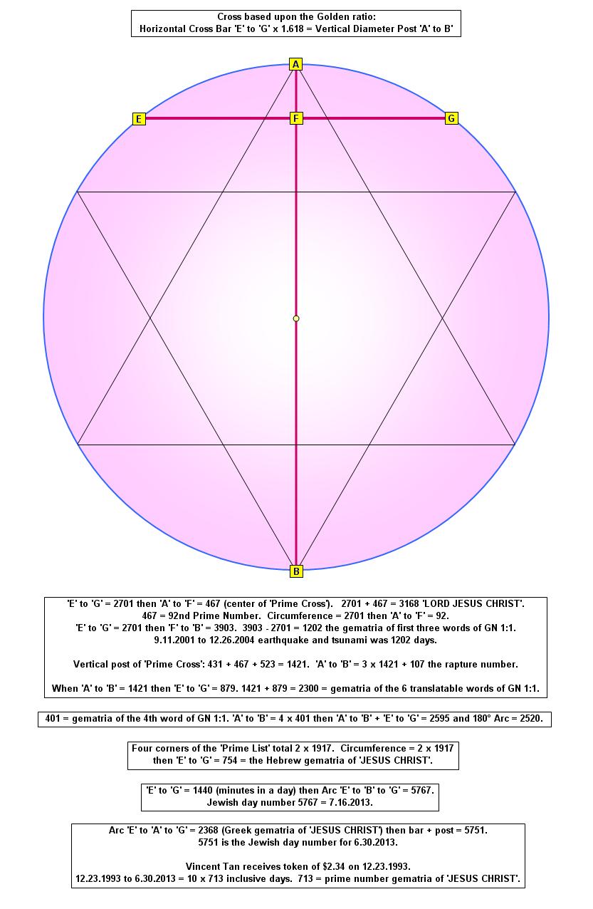 2701 is the gematria of Genesis 1:1. 14 May 2013 will be 2701 days from the date at the top of my 'Circle of Time' diagram (21 December 2005 the Winter Solstice).The diameter of this 'Circle of Time' is 1440 > the number of minutes in a day.14 May 2013 plus the 2300 days in Daniel 8:14 will be the last day (31 August 2019) of the current Islamic calendar cycle (their year 1440).Rosh Hashanah 5760 was 11 September 1999.5760 = 4 x 1440.11 September 1999 plus 4995 inclusive days will be 14 May 2013.4995 is the total gematria of all 27 values in either the Hebrew, or Greek alphabets.Rosh Hashanah 5770 to 14 May 2013 equals the 1335 days in Daniel 12:12.******The Jewish calendar is based upon lunar cycles.888 is the Greek gematria of 'JESUS'.14 May 1948 + 888 lunar cycles (26,223 days) = 29 February 2020 > the 490th Gregorian leap-day/year since the birth of Christ > 490 = seventy sevens in Daniel 9:24.******153 is the trinity reduction of the gematria for 'JESUS': 888 reduces down to 153.1 radian = 180 / Pi = 57.29577951 degrees.I assigned this value (57.29577951) to days and counted the days from Israel's rebirth (14 May 1948) in 'radian' steps.153 radian days = 8644 days = 24 years (8+8+8).14 May 1948 + 1 x 153 radian days = 14 May 197214 May 1948 + 2 x 153 radian days = 14 May 199614 May 1948 + 3 x 153 radian days = 14 May 202014 May 2020 minus the additional 75 days in Daniel 12:11-12 = 29 February 2020.Rosh Hashanah 5763 (26 September 2003) + 3700 (gematria of the 12 tribes on the breastplate) days = 12 November 2013.12 November 2013 + 2300 days in Daniel 8:14 = 29 February 2020.Since Veteran's (Armistice) Day (11.11.13 in the U.S.A.) immediately precedes 11.12.13, I could see 11.11.13 as the last day to make our peace with the Lord before going home.11.12.13 is an interesting date sequence > 11 > 12 > 13. 11+12+13 = 36 and the 36th triangle number is 666.******From the day that 153 people died in the Nigerian plane crash (3 June 2012) to 12 November 2013 will be 527 days (Jared was 527 when Enoch was taken).******See my attached diagram for the golden ratio connection between 467 and the gematria of Genesis 1:1 (2701).note: Clay and I both had markers for 17 October 2004.467 + 2701 (GN 1:1) = 3168 (LORD JESUS CHRIST) > the 467th prime number is 3313.17 October 2004 + 3313 days = 12 November 2013.17 October 2004 was 1480 (CHRIST) days since Ariel Sharon visited the Temple Mount.******