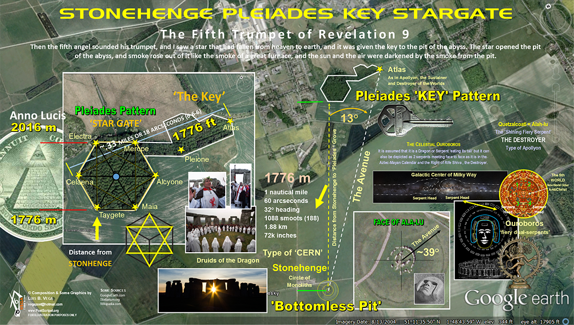 Given the volatile nature of the current Middle East geo-political downward spiral, a war and subsequent treaty amongst Israel, the Muslims and the Quartet could initiate such a week of years that in fact is stipulated in the Oslo Accords already. It could also make provisions for the start of the construction of the 3rd Temple as a spoil or stipulation of Israel’s victory over the Psalm 83 inner right of Muslim nations invading Israel. Based on the pattern and esoteric nuances of the geometry of Stonehenge and its environs, it would appear that there is an overtone of the depiction of Revelation 9 Angel that is associated with a Star falling from Heaven that initiates a Key to unlock the Pit of the Abyss. Will there be any significant astrological and/or astronomical alignments that will be a tell-tale sign? Is this one of the purposes of such a geometric configuration at Stonehenge for the Druids of the Red Dragon to track this count-up to their ‘Year of Lucifer’? In essence, it could make 2017 the year of such a possible initiation or ‘release’ as a pattern or type.
