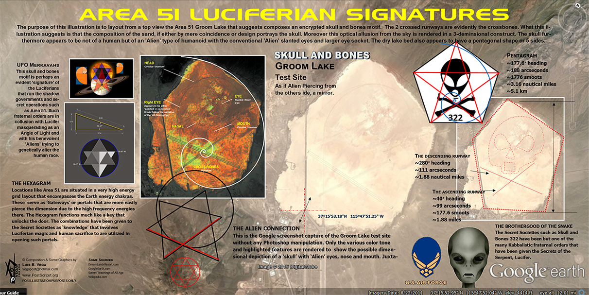 This study suggests that the layout from a top view of the Area 51 Groom Lake composes an encrypted skull and bones motif. The 2 crossed runways are evidently the crossbones. The composition of the sand, if either by mere coincidence or design portrays the skull. Moreover this optical allusion from the sky appears to render the ‘skull’ in a 3-deminsional construct. It is as if the dry lake bed is a mirror or glass looking into the very dimension from the Greys come from, the realm of the Fallen Angels that have geo-engineered them. The skull furthermore appears to be not of a human but of an ’Alien’ type of humanoid with the conventional ’Alien’ slanted eyes and larger eye socket. The dry lake bed also appears to have a pentagonal shape or 5 sides.