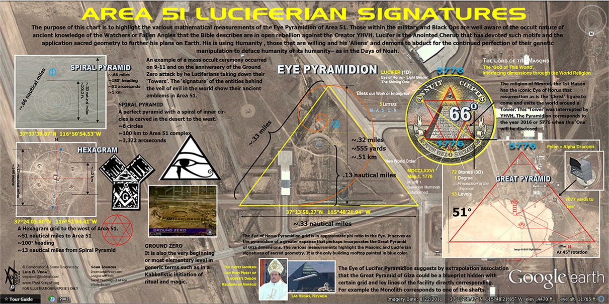 In summary, the whole Area 51 ley-line anomalies with pyramids, sacred geometry and motifs convey the long exposed and easily recognized signatures of the occult and Luciferians. Such obscure phenomena constitute ‘altars’ to Lucifer made by men and women in league with such Fallen spiritual entities. The coming ‘Disclosure’ will be the deception that such secret working on the part of Lucifer has been the cause of remaking Creation and Humanity into his image and likeness while his allotted time remains. For such purposes, it appears that Area 51 with the application of sacred geometry serves to only further his plans on Earth. Such undertakings are done in secret and in the dark using ritualistic magic that involves pyramids, ley-lines and motifs to genetically manipulate and deface humanity of its humanity, as in the Days of Noah.