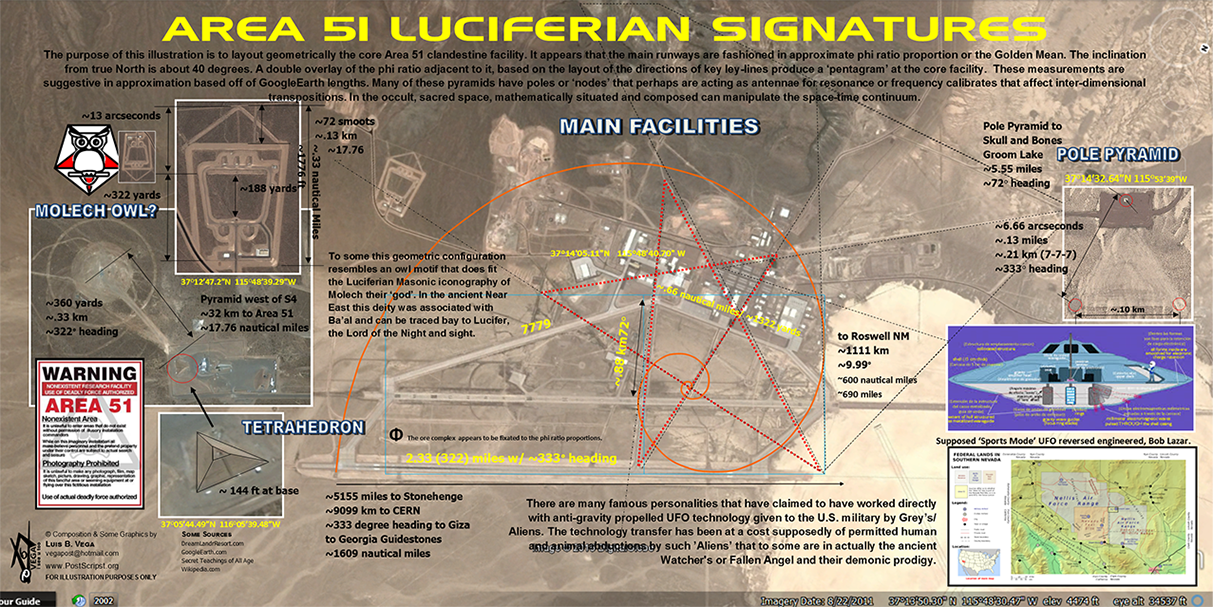 Obviously there are no doubt countless other clandestine aspects to the top secret base of Area 51 that exists but have not yet been disclosed to the public. Perhaps the energies and ley-lines converging at these specific points in and around the secret base provide a natural conduit of vortexes when applied with Luciferian ritualistic magic. These occultic associations are seen and acknowledged to occur at certain key sites around the world where sacred ritualistic magic and human sacrifices are also performed and paranormal actives occur. Interestingly these sites usually have occultic motifs such as pyramids, sacred grid lines, hexagrams and a mathematical phi ratio proportion to them. These are the ‘signatures’ of Lucifer. Not surprisingly, Area 51 has all this plus more.
