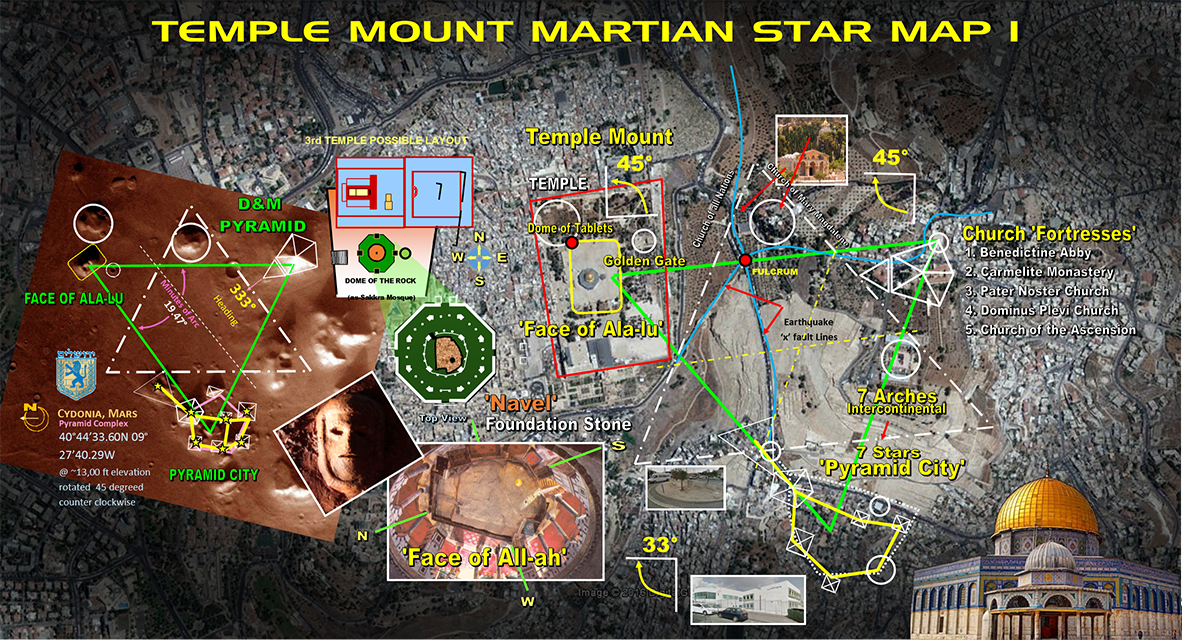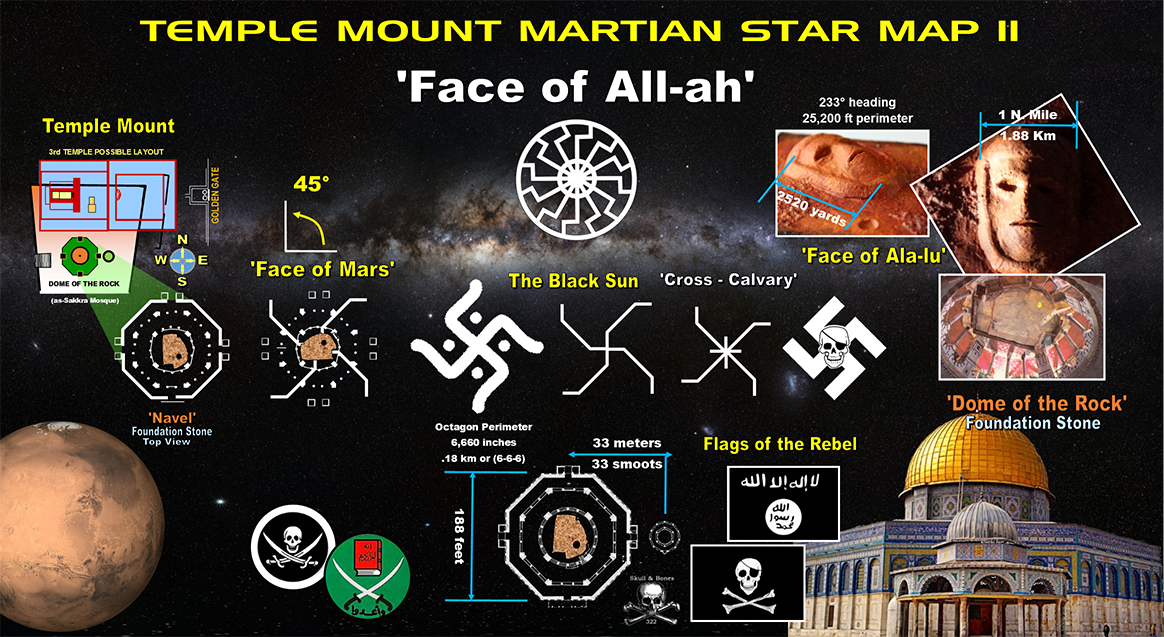 The purpose of this study is to suggest that the Temple Mount in Jerusalem, in part has been cryptically incorporated to mirror the Cydonia Martian Motif design layout by the Luciferians. This Mars template consists of 3 main pyramid structures spanning the distance of approximately 33 square miles. It consists of the 7 Pyramid Pleiadian City, the Pentagon Pyramid Fortress and the Face of Mars. In particular, this ‘Face of Mars’ is alleged to be a temple or mausoleum to their demigod, Ala-lu. This study strongly suggests that the Foundation Stone within the ‘mausoleum’ or temple of the Dome of the Rock on the Temple Mount is a commemorative motif corresponding to the Face of Mars. Moreover, this ‘Face of Ala-lu’ is none other than a cryptic inference to Allah, the ‘God’ of Islam that seeks to usurp the authority and dominion of YHVH’s Throne and His People’s Birthright. This Ala-lu is attributed to have been the ‘Rebel King’, a ‘pirate’ of the planet Nibiru. He is supposed to have been the ‘Elohim’ that was expelled and found his way to Earth.