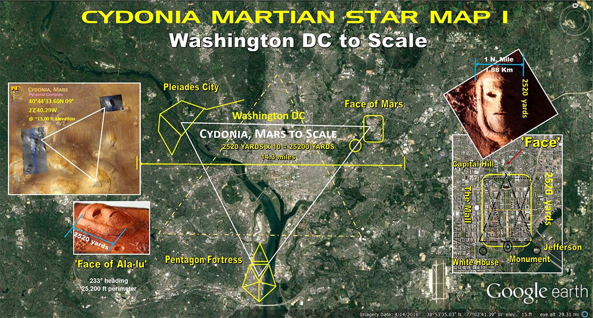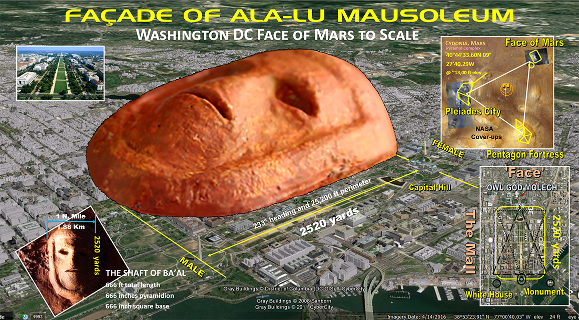 How big is the actual Martian Motif? For the purposes of illustration the approximate scale of the Face of Mars mausoleum is comparable to the core of the city of Jerusalem and its surroundings from the Mount of Olives to the Mamila Cemetery. In comparison, the Martian structures were massive in size taking up the entire width and breathe of the ancient city of Jerusalem. It is approximately 13-15 miles wide or about 33 square miles.  The size of the Face of Mars ‘temple’ or mausoleum would envelope the entire Washington DC Mall from the obelisk of the Washington Monument to just above the Capital Building, which by the way has a ‘face’ of the Luciferian owl god Molech and are in phi ratio in terms of distance. In comparison to scale, the size of the Pentagon Pyramid Fortress would look like a massive mountain. Also in scale at Jerusalem the layout and dimensions of the Face of Mars appears to be in phi ratio from the Mount of Olives, the Dome of the Rock to the Mamila Cemetery.