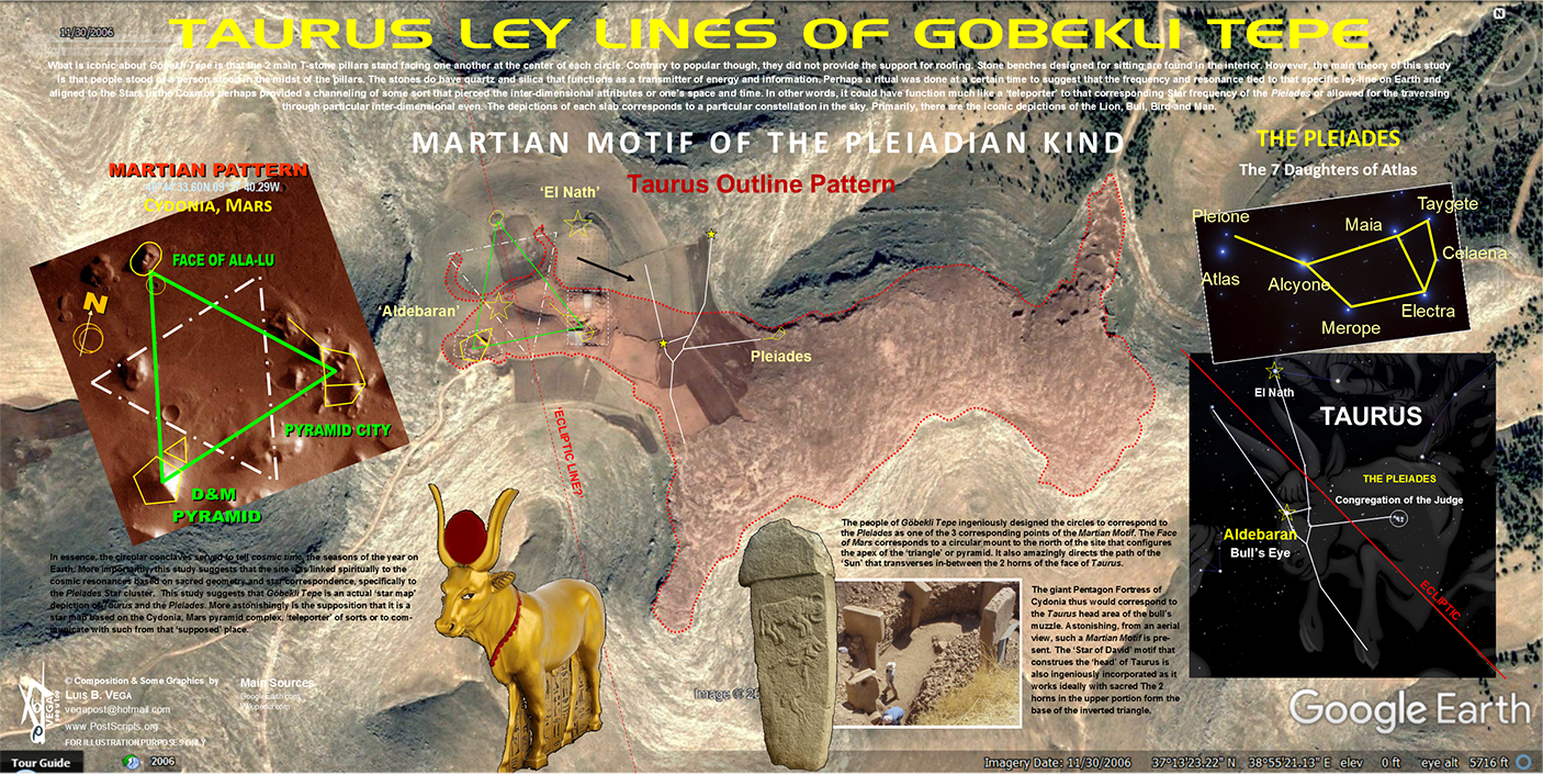 Such ancient civilizations had a ‘forgotten knowledge’ or kept secret of the association of Earth’s sacred geometry and how various ley-lines resonate at certain energy points, etc. It is on one level, a harnessing of the cosmic energies that are used for yet to be determined purpose fully. One possible function was and or is to function much like a ‘Stargate’ as in a ‘teleporter’ of sorts or to communicate with such from that ‘supposed’ place. This notion is supposed by what is produced 3-deminsinally when the double tetrahedrons are interlinked; they form a perfect cube or ‘chamber’. The sacred mount of Göbekli Tepe appears to have this Martian Motif as the ‘head’ portion that depicts the constellation of Taurus. Perhaps such an ancient civilization was venerating that period of the Procession of the Equinox, as nearly 10,000 BC was when the constellation of Taurus was the ‘House’ of the Zodiac that ruled the Cosmos.