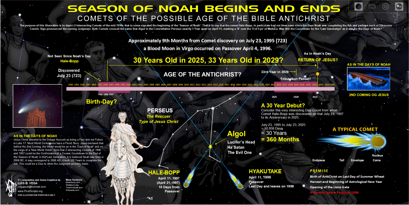 The purpose of this study is to consider if Comet Hale-Bopp could have very well signaled the Birth of the AntiChrist. The Comet was 1st Identified on July 23, 1995 (723). If this was the presumed Birth Date, that one is presenting, approximately 9 Months later was the End of Passover 1996. And? That is when the Comet Hyakutake eclipsed the Red Eye of Satan in the Celestial Motif identified as the Head of Medusa. That was on April 11, 1996, some 7 Days after Passover.