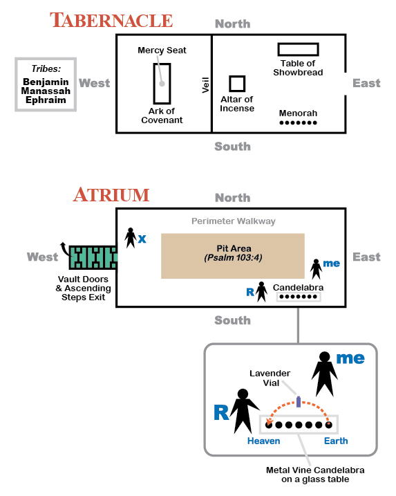 1) By orienting the Atrium layout to the layout of Moses' Tabernacle, the correct North, South, East, West directions are established. This seems correct to me, and important. The orientation point is the CANDLESTICK. I've put it in the diagram where it was in the dream. Thus, it matches the location of the Candlestick (Menorah) in the Tabernacle.