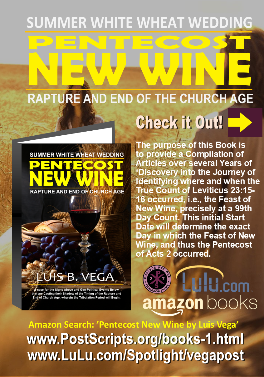 And those were the First Fruits of the Feasts of Gain, Wine and Oil, etc. Thus, to this end, the Book presents the possible Answers to these Discrepancies that shed New Understand into the Quest to know when the Church Age will conclude. One contends that the End of the Church Commission is to be accentuated by the Rapture Event, as the Last Day. And that the Day will Prophetically Correspond and Complement the Day on which it started, on the Feast of New Wine. This is ones Working Theory.
