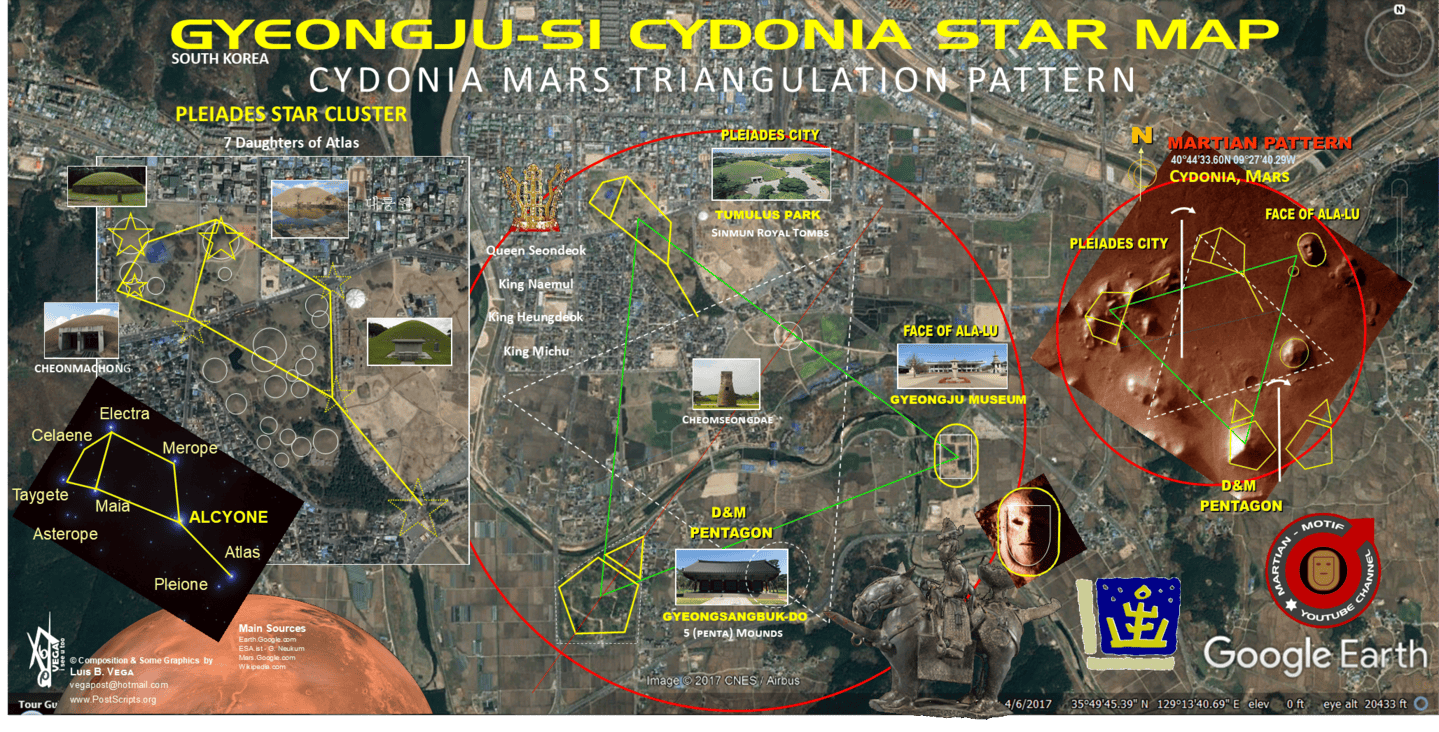 Now the following will show the Triangulation Correspondence of the Cydonia, Mars Structures and how they relate to the Ancient Sacred Site of Gyeongju-Si in South Korea. What is common in most Ancient and Modern Sites of this Cydonia, Mars Triangulation is how the Distance and Correspondence are based on precise Ground Lengths. In the case of the Gyeongju-Si, the Royal Tombs, called Tumulus Park, correspond to the Pleiades Star Cluster. Then the Face of Ala-lu corresponds to the Gyeongju Museum.