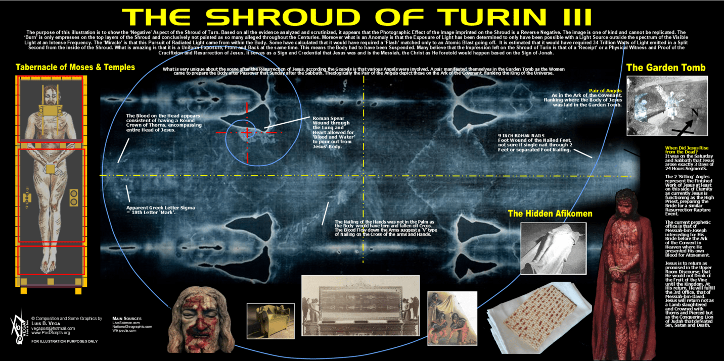 That they were on both Sides of this Shroud. And they were wrapped around a Figure. So, they were not Flat. They were wrapped around. So, what does that mean? You look at… Why is it so separate? Why one would not influence the other? And then you realize, for Heaven Sakes, we never noticed it, that there is a Horizontal Object.It was never noticed before, going through, which slices this Shroud, this Shroud Body into 2 Halves. One has nothing to do with the other. What is this single Phenomena that causes that? We are dealing with 2 Event Horizons. And they are already a little bit familiar with the Event Horizons. Only they are a little bit different than these Shroud Event Horizons. The Event Horizon is an object which when you approach, it cuts Space-Time into 2 Halves.One you can know, up to a point, which you are approaching from your Side. But that will be a Point when you cannot do anything anymore, but is behind it. The Last Photon would hit it; the Last Time Quanta would hit it. And after that, ‘Whoosh…’ Nothing. …For all Practical Purposes, Time and Space have stopped. We are very close to it and I will explain.…Suddenly at the Event, it began to levitate. Yes, the Gravity was defeated. The 2nd Law. Then Time and Space stops. And there is a Total, for the 1st Time in the History of the Universe, there is a Total Time Collapse. And even Nature, the Scriptures kind of hint at it; that Strange Things were happening. That was the Moment when Time stopped. Well, then when Time stops, the very Last Information it had, it would project on the Event Horizon, on both Sides.And then finally they had no Event Horizon. It then released its Secret; that there was a ‘Big Bang’ Type of Singularity. There was an Explosion which cannot be described. The Universe would have stopped existing, if somehow it would not have been cut to a very, very Minimal Time. And that is why we see on this Shroud, an ‘Unknown Thing’ which looks like Burn, but it is not.____________________