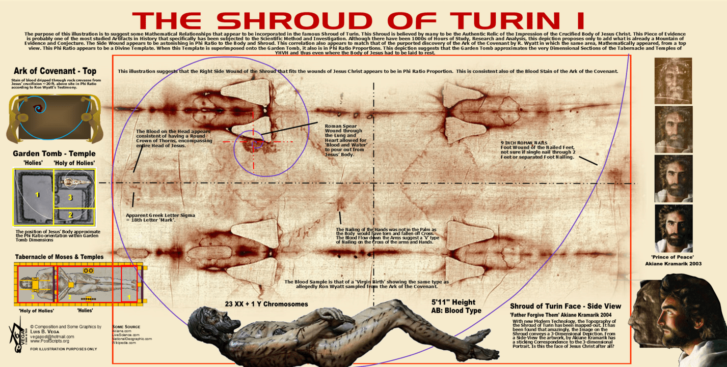 In that case, the Face of the Man, from a Side-View ‘exactly’ matches the Painting done by the Child-Prodigy, Akiane Kramarik’s, Prince of Peace. Now in one’s own Research into the Shroud, one’s only Contribution was/is that the Wound where the Spear pierced Jesus’ Side and went through several Organs and the Heart was amazingly in Phi Ratio to the whole Body of Jesus, from Head to Feet.This is the case if one takes the entire Cloth, divides it in half and then superimposes the Phi Ratio Spiral for a better Visual Effect. What the Phi Ratio suggests is that even where in the Body of Jesus, the Piercing of the Body of the Son of GOD, in the Flesh would occur as foretold by Zechariah; that the Messiah would be ‘Pierced’ through. The other Amazing Aspect is that the Garden Tomb, having 3 Sections is like a Facsimile of the Tabernacle and Temples of YHVH, Israel possessed. See Chart Link for a Visual in the End Notes. Even where Jesus’ Body was laid in the Garden Tomb was in Phi Ratio in reference to the total layout of the Tomb.