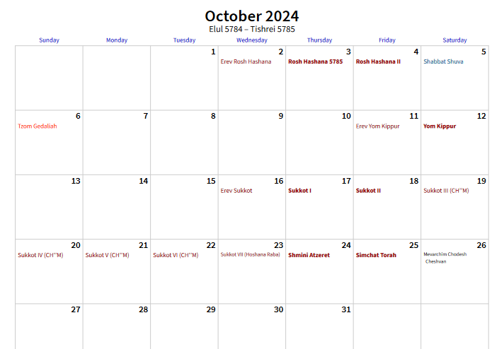 Below is October 2024 with the changeover from Elul 5784 to Tishrei 5785.Regards,Olaf V