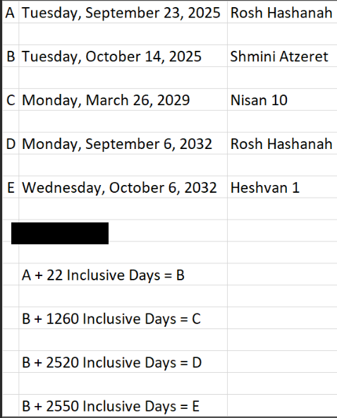 If the Feast of Trumpets comes and goes without a Rapture Event don't give up hope for 2025. Although a Feast Day can accommodate more than one significant event, the Fall Feasts may all be fulfilled in a row in 2032, like the Springs Feasts were . Basically, we have up until October 14 for the current timeline. The gap could be shorter than 21 days or even no gap at all.