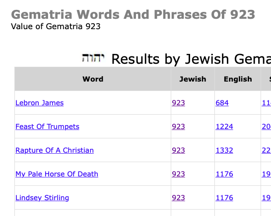 DO A SIMPLE SEARCH ON THE KEY WORDS - GEMATRIA OF 923 - AND I GOT THIS - I don’t usually put much into Gematria, but I heard this from someone - and thought i would share it -